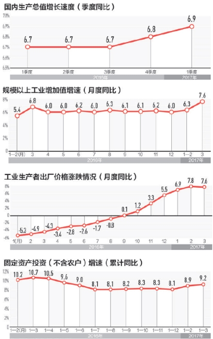 在4月17日举行的国新办新闻发布会上,国家统计局新闻发言人毛盛勇表示,一季度GDP同比增长6.9%,比上年同期加快了0.2个百分点,比上年四季度加快了0.1个百分点。“坚持稳中求进的工作总基调,贯彻落实新发展理念,以推进供给侧结构性改革为主线,中国经济延续了稳中向好的发展态势,主要指标好于预期,实现了良好开局,为实现全年发展预期目标,并在实际工作中争取更好成绩打下了扎实基础。”
