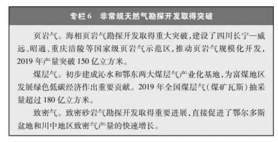 提高天然气生产能力。加强基础地质调查和资源评价,加强科技创新、产业扶持,促进常规天然气增产,重点突破页岩气、煤层气等非常规天然气勘探开发,推动页岩气规模化开发,增加国内天然气供应。完善非常规天然气产业政策体系,促进页岩气、煤层气开发利用。以四川盆地、鄂尔多斯盆地、塔里木盆地为重点,建成多个百亿立方米级天然气生产基地。2017年以来,每年新增天然气产量超过100亿立方米。(见专栏6)