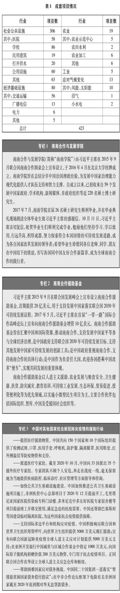 ——援建成套项目。2013年至2018年,中国共建设成套项目423个,重点集中于基础设施、农业等领域。除传统的“中方代建”援建模式外,在部分有条件的国家试点“受援方自建”方式,即在一些有完备工程建设招投标管理体系、具有组织实施经验的国家和地区,中国提供资金和技术支持,由有关国家自行负责项目的勘察、设计和建设及过程管理。(见表1)