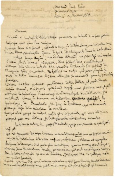 第一封手稿为1872年1月30日马克思致《资本论》法文版出版人拉沙特尔(Lachatre)的书信。书信揭示了多个重要信息,如确定以即将修改的《资本论》德文版第二版作为法文版的翻译底稿;接受法文版出版人的建议,同意以分册形式出版《资本论》法文版。