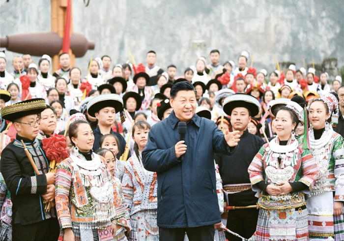 2021年2月3日至5日,中共中央总书记、国家主席、中央军委主席习近平来到贵州考察调研,看望慰问各族干部群众,向全国各族人民致以美好的新春祝福。这是3日下午,习近平在毕节市黔西县新仁苗族乡化屋村文化广场上,向全国各族人民、港澳台同胞和海外侨胞拜年。 新华社记者 谢环驰/摄