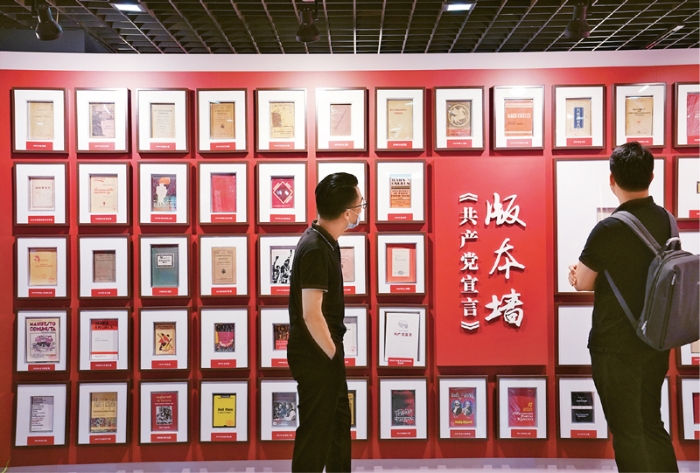 学习社会主义发展史对于坚定信念信仰具有重要意义。图为观众在上海市档案馆外滩馆参观“真理之甘 信仰之源——纪念陈望道首译《共产党宣言》中文全译本100周年主题展”。 新华社记者 刘颖/摄