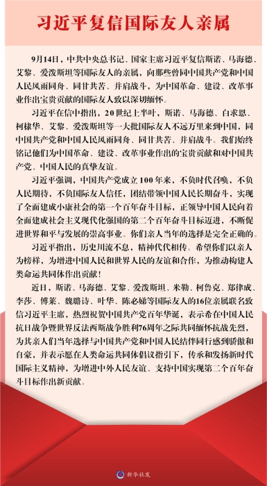 新华社北京9月17日电 9月14日,中共中央总书记、国家主席习近平复信斯诺、马海德、艾黎、爱泼斯坦等国际友人的亲属,向那些曾同中国共产党和中国人民风雨同舟、同甘共苦、并肩战斗,为中国革命、建设、改革事业作出宝贵贡献的国际友人致以深切缅怀。