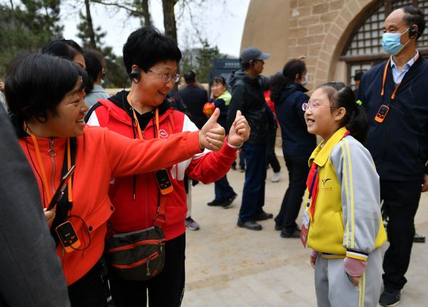 4月22日,在延安市杨家岭革命旧址,小讲解员毛雨昕(右二)与参观者交流。新华社