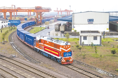 中欧班列在保障全球供应链方面发挥了重要作用。图为10月22日,中欧班列金华至莫斯科公共班列首发启程。胡肖飞摄(影像中国)