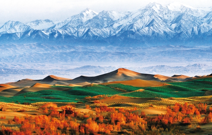 党的十八大以来,以习近平同志为核心的党中央以前所未有的力度抓生态文明建设,我国生态环境保护发生历史性、转折性、全局性变化。甘肃省张掖市黑泉村曾长期受风沙袭扰,经过当地村民数十年不懈努力,肆虐的“黄龙”被层层“绿网”牢牢锁住,实现了“绿富同兴”。图为祁连山下的西沙窝防风固沙林带。 郑耀德/摄