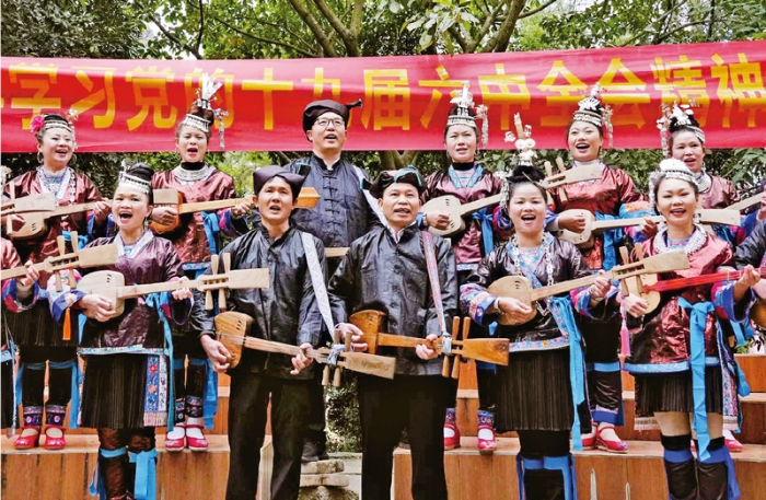 近期,全国各地围绕学习宣传贯彻党的十九届六中全会精神组织开展形式多样、内涵丰富的文化文艺活动。图为2021年12月12日,广西柳州市融水苗族自治县组织驻村工作队员和民间歌手等以侗族琵琶歌形式宣讲全会精神。 人民视觉 龙涛/摄