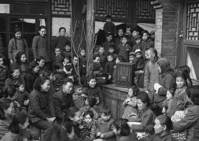 1953年3月,北京市贯彻婚姻法运动委员会举行宣传贯彻婚姻法广播大会。图为西单区中街十九号里聚集着收听广播的各户居民。
