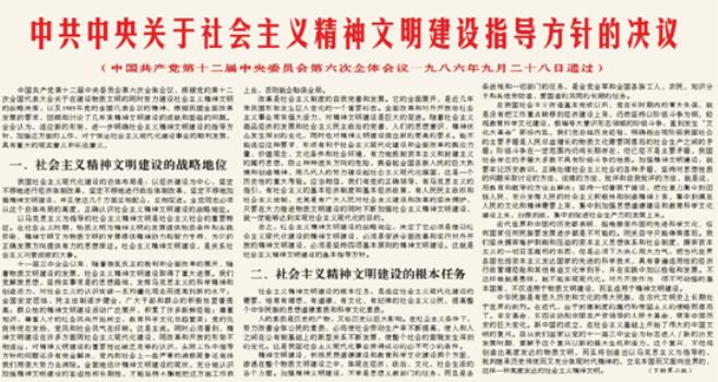党的十二届六中全会通过《中共中央关于社会主义精神文明建设指导方针的决议》。