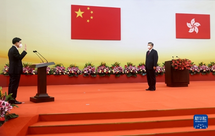 7月1日上午,庆祝香港回归祖国25周年大会暨香港特别行政区第六届政府就职典礼在香港会展中心隆重举行。中共中央总书记、国家主席、中央军委主席习近平出席并发表重要讲话。这是习近平监誓,香港特别行政区第六任行政长官李家超宣誓就职。 新华社记者 鞠鹏 摄