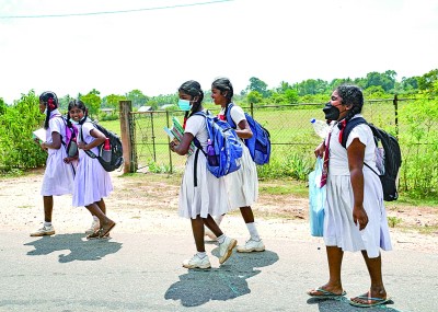 3月11日,在斯里兰卡瓦武尼亚地区,学生们走在学校附近的乡道上。新华社发