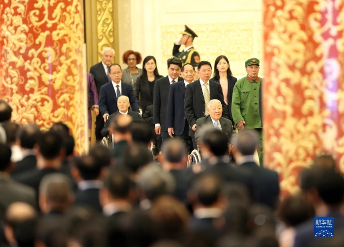 2019年9月29日,国家勋章和国家荣誉称号获得者进入人民大会堂金色大厅。当日上午10时,中华人民共和国国家勋章和国家荣誉称号颁授仪式在北京人民大会堂隆重举行。新华社记者 姚大伟 摄