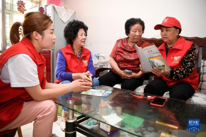 王兰花(右一)与志愿者一起在社区居民家中宣传消防安全知识(2021年6月16日摄)。新华社记者 王鹏 摄