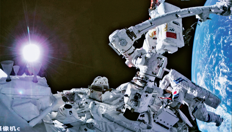 2022年9月17日17时47分,经过约5小时的出舱活动,神舟十四号航天员陈冬、刘洋、蔡旭哲密切协同,完成出舱活动期间全部既定任务,航天员陈冬、蔡旭哲已安全返回问天实验舱,出舱活动取得圆满成功。图为在北京航天飞行控制中心拍摄的航天员在舱外操作的画面。 新华社记者 郭中正/摄