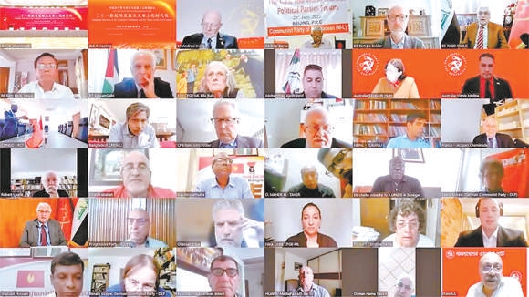 党的十八大以来,习近平总书记深刻总结历史经验,深入分析国际国内大势,科学把握我国面临的战略机遇和风险挑战,就党的对外工作作出一系列重要论述,丰富和发展了马克思主义党际关系理论。2022年7月28日,中国共产党与世界马克思主义政党论坛举行。习近平总书记在贺信中强调,中国共产党愿同各国马克思主义政党加强交流对话,立足本国国情,把准时代脉搏,不断丰富和发展马克思主义,在携手推动构建人类命运共同体的进程中让马克思主义展现出更强大的真理力量。图为外国政党代表线上参加论坛。 中联摄