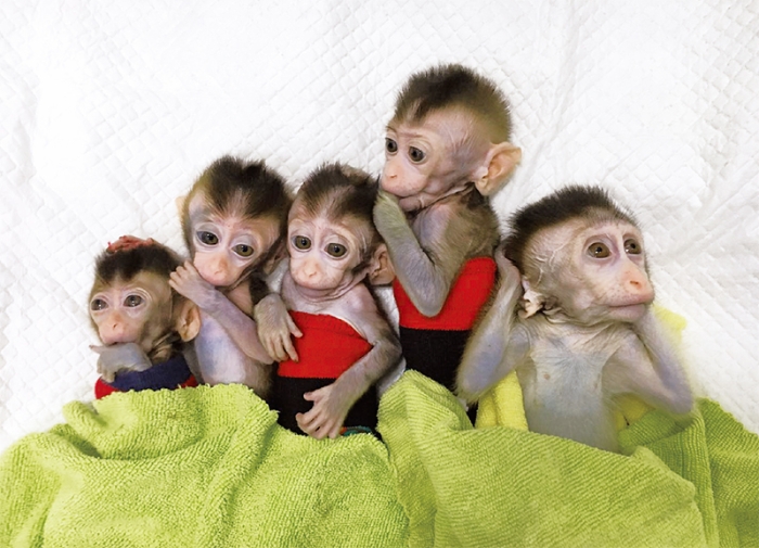 中国科学院神经科学研究所研究团队经过3年努力,利用基因编辑技术,成功构建了世界首例核心节律基因BMAL1敲除猕猴模型。该成果为脑认知功能研究、重大疾病早期诊断与干预、药物研发等提供了新型高效的动物模型。图为5只生物节律紊乱体细胞克隆猴。 新华社发 中国科学院神经科学研究所供图