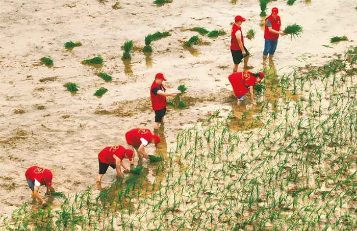 2022年8月4日,在湖南省永州市道县寿雁镇玉蟾岩稻作文化园,党员志愿者在帮助种粮大户抢插晚稻。正值农忙“双抢”时节,寿雁镇组织党员志愿者深入农田一线,帮助农民抢插晚稻,助力粮食生产。 新华社发 蒋克青/摄