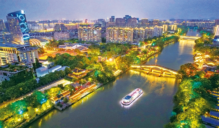 浙江省全面加强京杭大运河杭州段人文景观建设,打造集文化、旅游、健身等功能于一体的市民乐园。图为2022年7月15日拍摄的“汉宫”号游船缓缓驶过京杭大运河拱宸桥段。 浙江省委宣传部供图 董旭明 鲍圣慧/摄