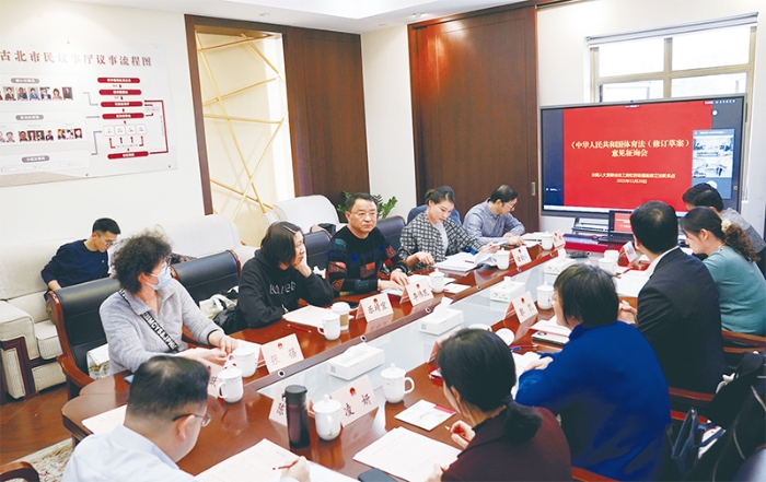 基层立法联系点是新时代中国发展全过程人民民主的生动实践。图为2021年11月26日,上海市虹桥街道基层立法联系点召开《中华人民共和国体育法(修订草案)》意见征询座谈会。 新华社记者 刘颖/摄