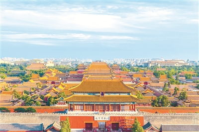 2022年11月28日,北京老城的中轴线遗产“全景图”最新公开,遗产区包含15处遗产构成要素,总面积约5.9平方公里。图为从景山上俯瞰北京中轴线。(图片来源:视觉中国)