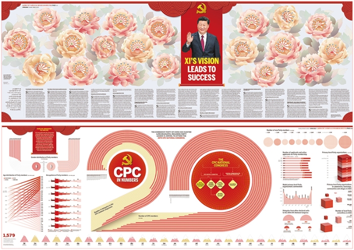 2022年10月16日,中国日报推出八联版,以充满中国文化元素、时尚大气的设计,通过各类数据,展示新时代十年伟大变革。 中国日报社供图