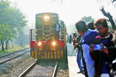 巴基斯坦铁路公司1月27日举行仪式,宣布将2022年从中国进口的铁路客车编入绿线特快列车组,正式投入载客运营。图为当日,人们在巴基斯坦伊斯兰堡等待绿线特快列车组进站。 新华社发
