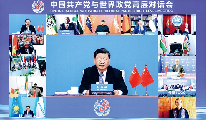 2023年3月15日,中共中央总书记、国家主席习近平在北京出席中国共产党与世界政党高层对话会,并发表题为《携手同行现代化之路》的主旨讲话。 新华社记者 刘彬/摄