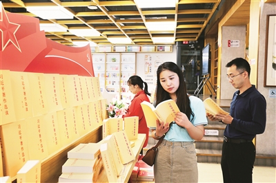 《习近平著作选读》第一卷、第二卷出版发行后,社会各界掀起学习热潮。图为5月8日,江西省萍乡市市民在新华书店翻阅《习近平著作选读》第一卷、第二卷。 邓建萍 摄