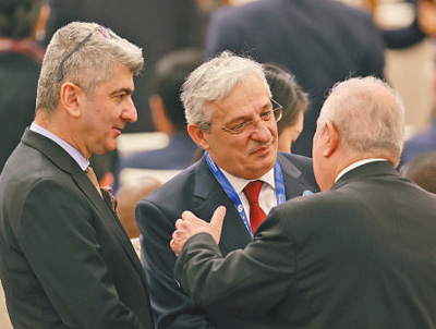 第三届“一带一路”国际合作高峰论坛开幕式现场,与会嘉宾在交谈。本报记者 张武军摄