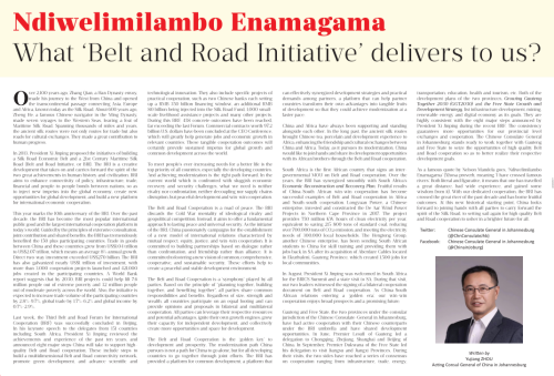 今年8月,习近平主席来南非出席金砖国家领导人会晤并对南非进行国事访问,两国元首见证签署《中南关于同意深化“一带一路”合作的意向书》。随着中南关系步入“黄金时代”,两国互利合作前景光明,未来可期。
