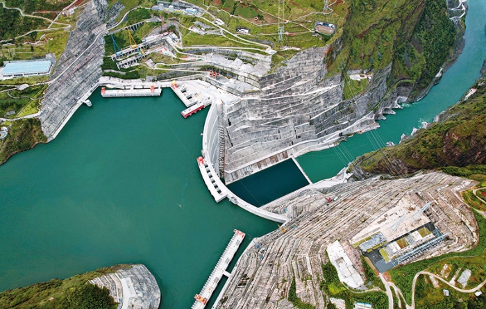2023年10月12日,金沙江白鹤滩水电站累计发电量突破1000亿千瓦时,相当于节约标准煤约3007万吨,减排二氧化碳约8240万吨,源源不断的清洁电能输送至江苏、浙江等地,保障长三角地区经济发展和民生用电需求。图为2023年10月12日拍摄的白鹤滩水电站(无人机照片)。 新华社发 闫科任/摄