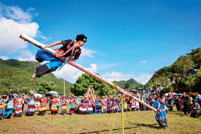 2023年8月10日是彝族传统节日火把节,广西百色市隆林各族自治县德峨镇阿搞屯的村民在取火祭火、祭送布谷鸟、打磨秋、抹黑脸、篝火晚会等民族特色活动中欢庆节日、传递祝福。图为村民展示彝族传统习俗——打磨秋。 新华社记者 胡星宇/摄