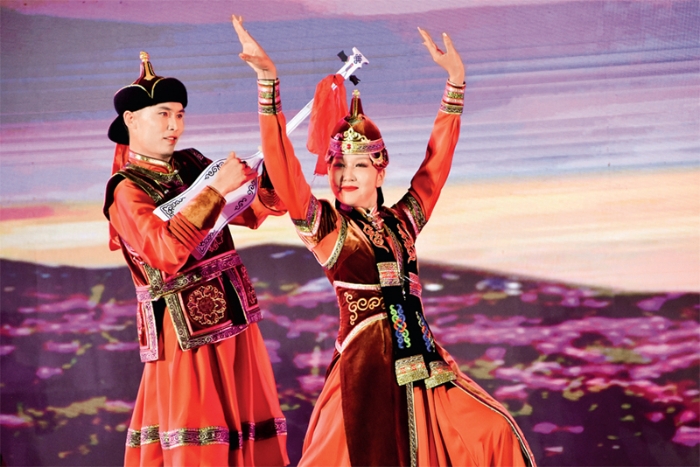 《玛纳斯》、《格萨尔》、《江格尔》三大民族英雄史诗是被纳入我国第一批国家级非物质文化遗产名录的文化瑰宝。2023年7月13日晚,在新疆克孜勒苏柯尔克孜自治州举行的第九届玛纳斯国际文化旅游节上,三大史诗同台会演,吸引众多观众前来观看。图为新疆博尔塔拉蒙古自治州歌舞团演员在表演《江格尔》。 新华社记者 张瑜/摄