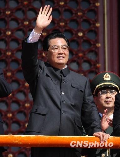△2009年10月1日,中华人民共和国成立60周年庆祝大会在北京天安门广场举行。中共中央总书记、国家主席、中央军委主席胡锦涛在天安门城楼上向受阅部队挥手致意。中新社发 杜洋 摄