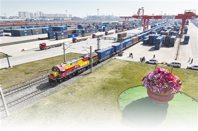 3月21日,陕西西安开行首趟至南美洲国家的国际铁海联运班列,搭载彩色液晶显示板等货物的列车从西安国际港站驶出,一路开往山东青岛港,并从青岛港转海运前往巴西马瑙斯。 刘 翔摄(影像中国)