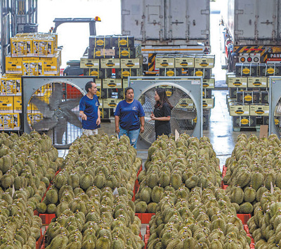 随着《区域全面经济伙伴关系协定》(RCEP)红利释放,中国—东盟自贸区建设深入推进,中国—东盟贸易规模进一步扩大,越来越多东盟国家的商品得以更加便捷地进入中国市场。图为泰国春蓬府一家榴莲工厂的工作人员查看刚采摘的榴莲。