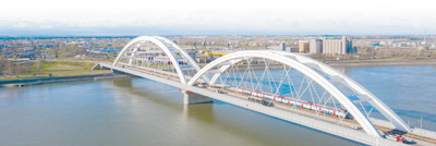 3月19日,中国与中东欧国家共建“一带一路”重点项目匈塞铁路塞尔维亚境内贝诺段(贝尔格莱德至诺维萨德)安全平稳运营满两周年,累计发送旅客超683万人次。图为列车行驶在贝诺段诺维萨德多瑙河大桥上(无人机照片)。