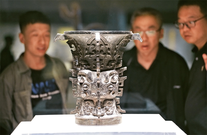 历史文化遗产承载着中华民族的基因和血脉。何尊是西周成王时期一个名叫“何”的宗室贵族所做的祭器,尊内底铸铭文中有“宅兹中国”四字,是“中国”一词最早的实物见证。图为2024年5月9日,游客在陕西宝鸡青铜器博物院内参观西周文物何尊。 新华社记者 邵瑞/摄