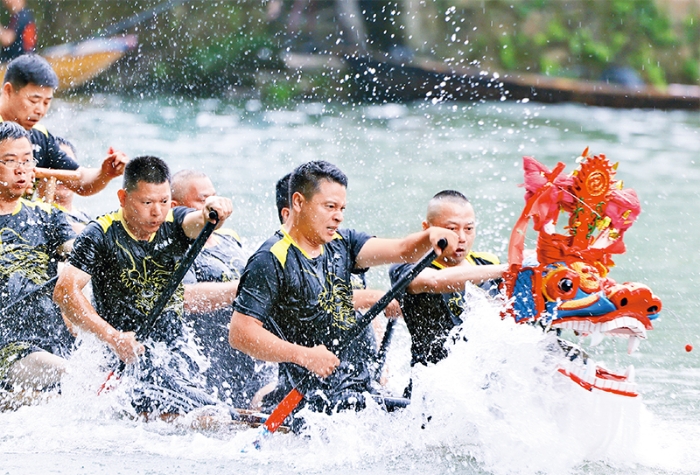端午节是中华民族重要的传统节日,也是传承中华优秀传统文化的重要载体。图为2024年6月10日,浙江杭州西溪国家湿地公园浪花飞溅,鼓点激昂,上演激动人心的端午传统项目“龙舟胜会”。 中新社发 周方玲/摄