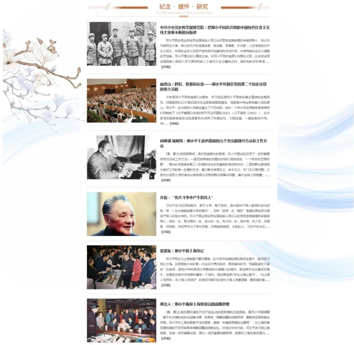 “纪念·缅怀·研究”栏目集中介绍邓小平诞辰120周年纪念活动及其报道,推送重点报刊、权威媒体网站发表的有关邓小平思想生平的纪念和研究文章,多角度、多层面呈现研究邓小平生平和邓小平理论的成果。