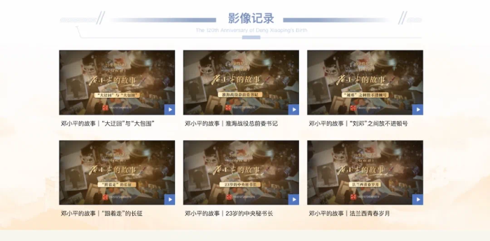 “影像记录”栏目通过生动的影像资料集中展示一批反映邓小平思想和生平的优秀文献片,包括近期由中共中央党史和文献研究院和国家广播电视总局联合出品的,正在各大视频网站及部分地方媒体上热播的《红相册·邓小平的故事》。