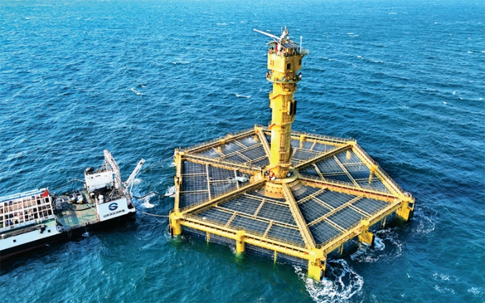 近年来,我国在一些共性技术研发创新上不断取得突破。图右侧为我国自主研制的大型全潜式深海智能渔业养殖装备——“深蓝2号”(2025年1月12日摄,无人机照片)。 新华社记者 李紫恒/摄