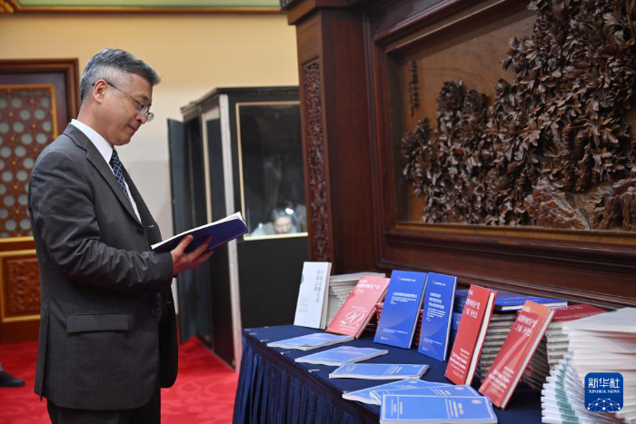 9月5日,参会嘉宾翻阅《回望历史 捍卫正义——世界反法西斯战争东方主战场的伟大贡献》智库报告。新华社记者 金良快 摄