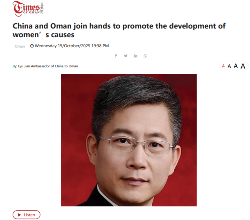 2025年10月15日,驻阿曼大使吕健在阿主流媒体《阿曼时报》发表署名文章《中国阿曼携手共进,共促妇女事业发展》,阐释习近平主席在全球妇女峰会开幕式上的主旨讲话精神,介绍中国妇女事业取得历史性成就,强调中国愿同阿曼共同传承和弘扬北京世妇会精神,携手落实全球妇女峰会共识。全文如下: