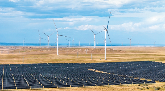 我国已构建起全球最大、发展最快的可再生能源体系。近10年来,我国风电及光伏发电年新增装机规模增长迅速,目前我国风光装机占全球总装机近半,新增装机占全球六成,可再生能源发电装机占比达60%左右。风能、太阳能资源丰富的新疆,是国家“十四五”规划纲要中明确的大型清洁能源基地。图为2025年7月1日,在新疆阿勒泰地区吉木乃县拍摄的50万千瓦时风电项目配套输电线路建设现场。 新华社发 努尔别克·努尔曼/摄