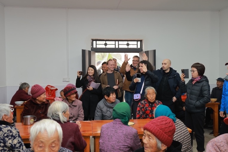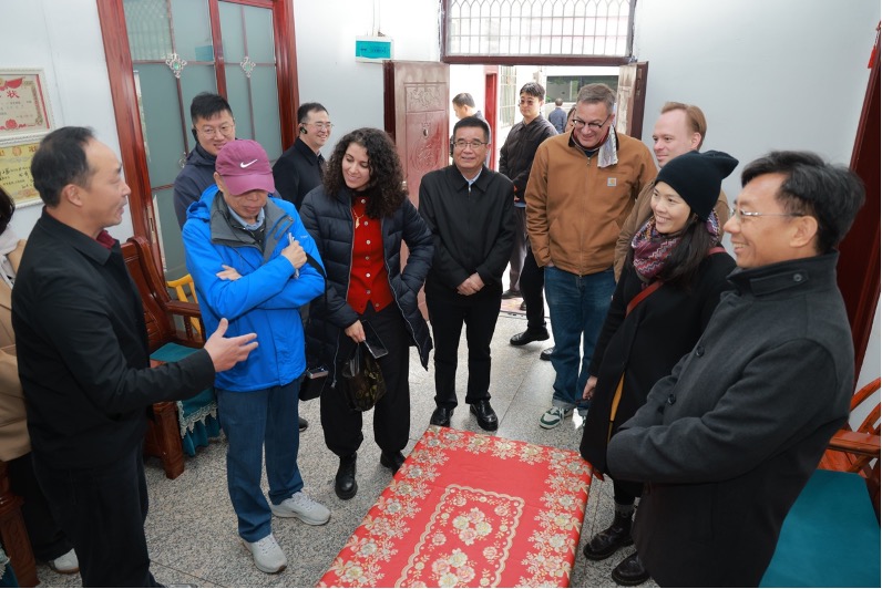 在开封市兰考县,考察团一行前往焦裕禄纪念馆参观,深入了解焦裕禄书记全心全意为人民服务、鞠躬尽瘁死而后已的伟大一生。在焦裕禄书记曾亲自带领除三害工作队查风口、追风源、寻找治沙办法的张庄村,考察团一行与驻村书记和当地引进现代农业、手工业企业奥吉特菌业有限公司、凯盛浩丰西红柿温室大棚项目、海璨工艺“共富工坊”的经营者和从业者进行谈话交流,当获悉全村农民人均收入从2013年的3400元增长到如今22000多元,引进企业就业人员多为当地剩余劳动力,特别是帮助农村妇女提高收入时,大家由衷感到欣喜,长期关注妇女权益问题的女性外籍学者高兴地上前拉着女工们一同合影留念。此外,考察团一行还参观了村里为80岁以上老人提供免费助餐服务的“幸福食堂”和村里的医疗卫生点,热腾腾的烩菜香气和配备了完善基础医疗设施的村诊所都给第一次近距离观察中国乡村生活的外籍学者们留下了深刻印象。