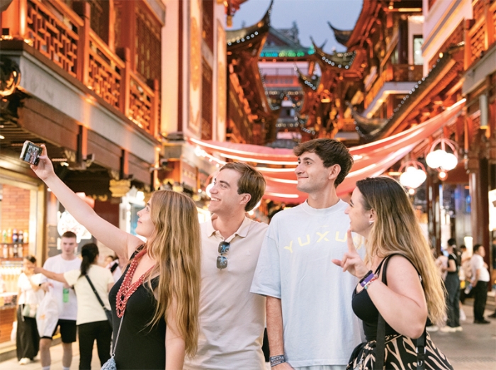 我国免签政策持续释放吸引力,入境旅游市场热度持续攀升。2025年上半年,外国人入出境数量稳步增长,达到3805.3万人次,同比上升30.2%;其中,免签入境外国人1364万人次,占入境外国人的71.2%,同比上升53.9%。图为2025年7月21日,西班牙游客在上海豫园商城留影。 新华社发 张悦/摄