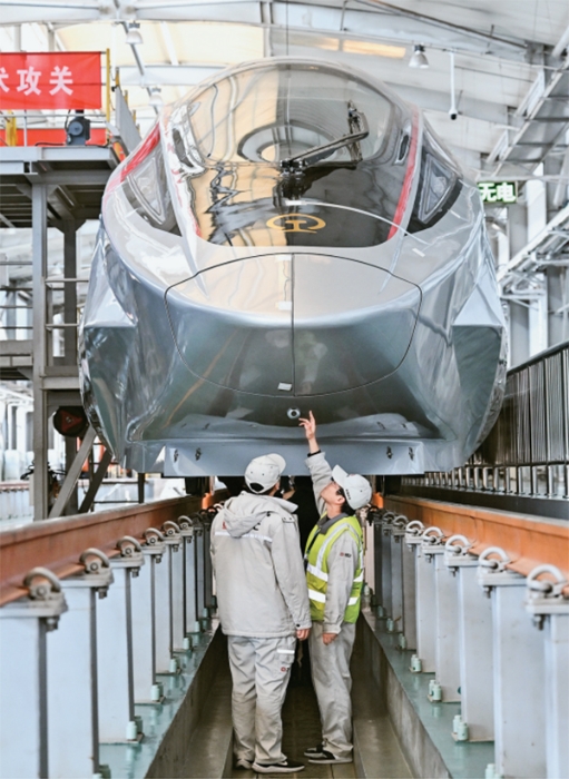 新型举国体制是社会主义市场经济条件下发挥集中力量办大事制度优势的重要方式。近年来,我国着力健全新型举国体制,坚决打赢关键核心技术攻坚战,推动科技创新不断迈上新台阶。2024年12月29日,“全球最快高铁列车”CR450动车组样车在北京首次亮相,标志着“CR450科技创新工程”取得重大突破。图为2025年2月25日,工作人员在铁科院国家铁道试验中心对CR450动车组样车进行试验验证。 新华社记者 李鑫/摄