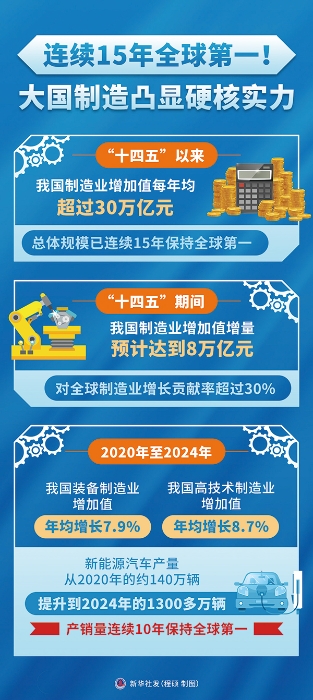 制造业是现代化的重要基础,是立国之本、兴国之器、强国之基,其发展水平决定着一个国家的综合实力和国际竞争力。“十四五”以来,我国制造业增加值每年均超过30万亿元,总体规模已连续15年保持全球第一,亮眼数据折射出大国制造的硬核实力。 新华社发 程硕/制图