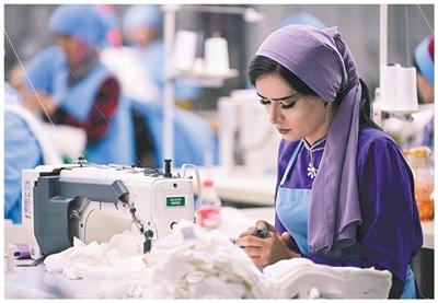 2025年9月12日,在塔吉克斯坦哈特隆州丹加拉区,一名工人在中塔合作项目丹加拉农业纺织产业园成衣车间工作。